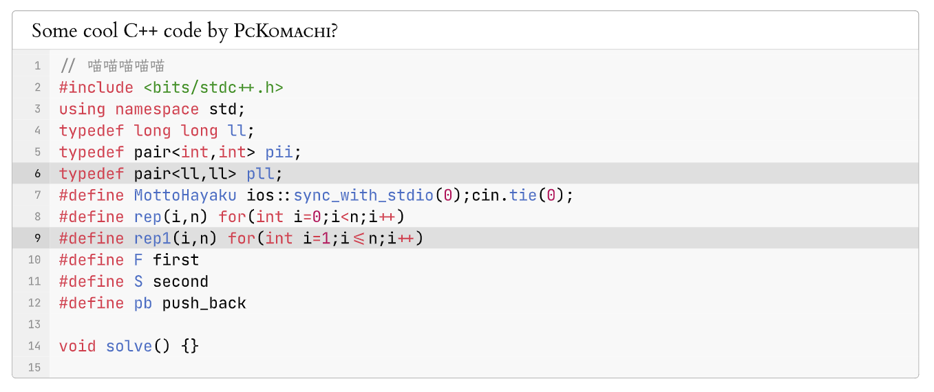 大概是比較沒創意的一個。我想加的是行號、背景色、highlight 指定行數之類的,實際辦法是開一個表格,第一欄是行號,第二欄是程式碼,一列放一行 line。